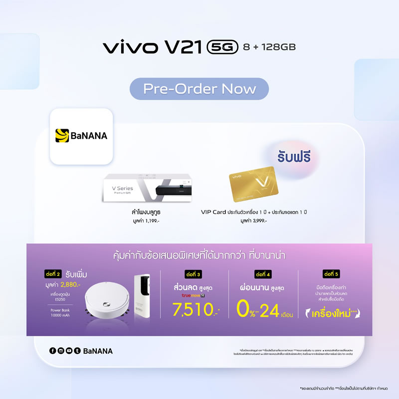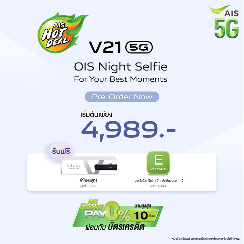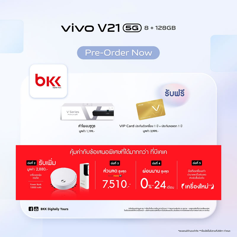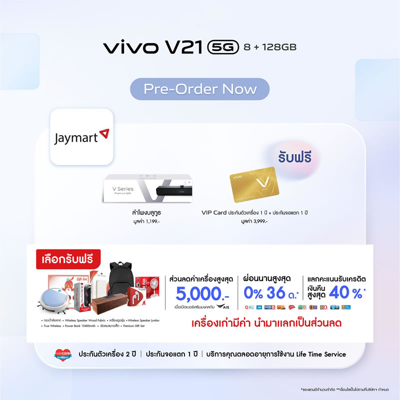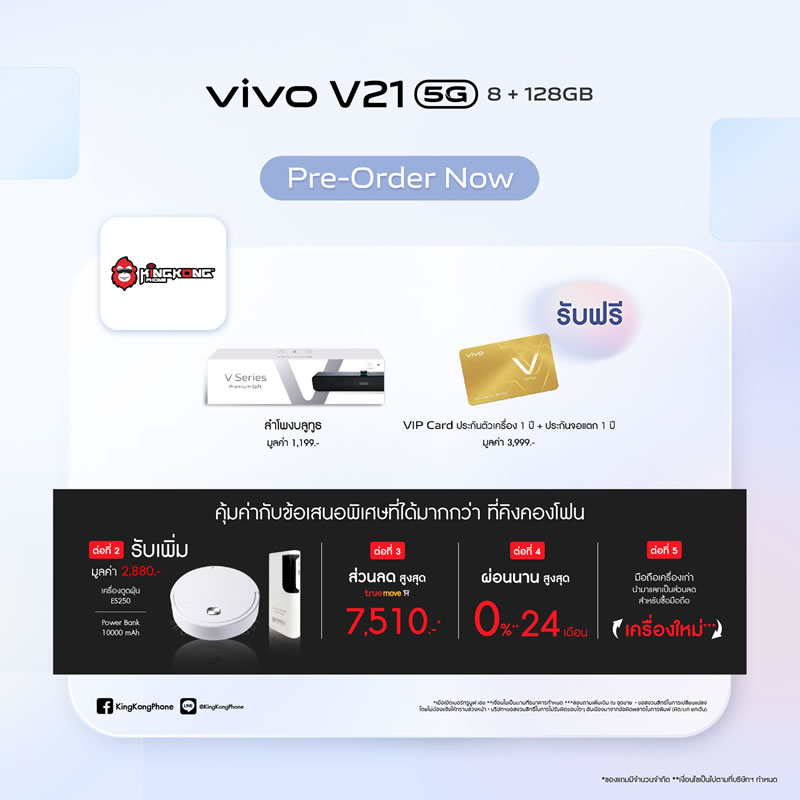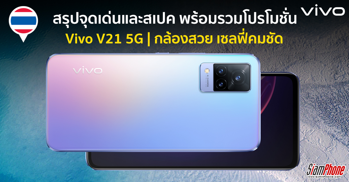 Vivo ประเทศไทยเปิดจองสมาร์ทโฟนรุ่นใหม่ V21 5G อย่างเป็นทางการแล้ว ด้วยจุดเด่นที่มีกล้องหน้าเซลฟี่ความละเอียดสูงมากถึง 44 ล้านพิกเซล พร้อมระบบป้องกันภาพสั่นไหว OIS ให้การเซลฟี่ของคุณคมชัดมากยิ่งขึ้น ดังนั้นบทความนี้จะสรุปจุดเด่นกับสเปกเบื้องต้นให้ได้ทราบกัน เผื่อว่าใครกำลังอยากจับจองเป็นเจ้าของ ราคาเพียง 12,999 บาท พร้อมรับฟรี! ลำโพงบูทูธ (มูลค่า 1,199 บาท) และ VIP Card ประกันตัวเครื่อง 1 ปี รวมถึงประกันจอแตก 1 ครั้ง ภายใน 1 ปี (มูลค่า 3,999 บาท) พิเศษแบบนี้ เฉพาะลูกค้าจองเท่านั้น ดีไซน์ตัวเครื่องหรูหรา และบางเบาเช่นเดียวกับรุ่นพี่ มาพร้อมกัน 3 สี Arctic White, Sunset Dazzle และ Dusk Blue รายละเอียดเพิ่มเติม...