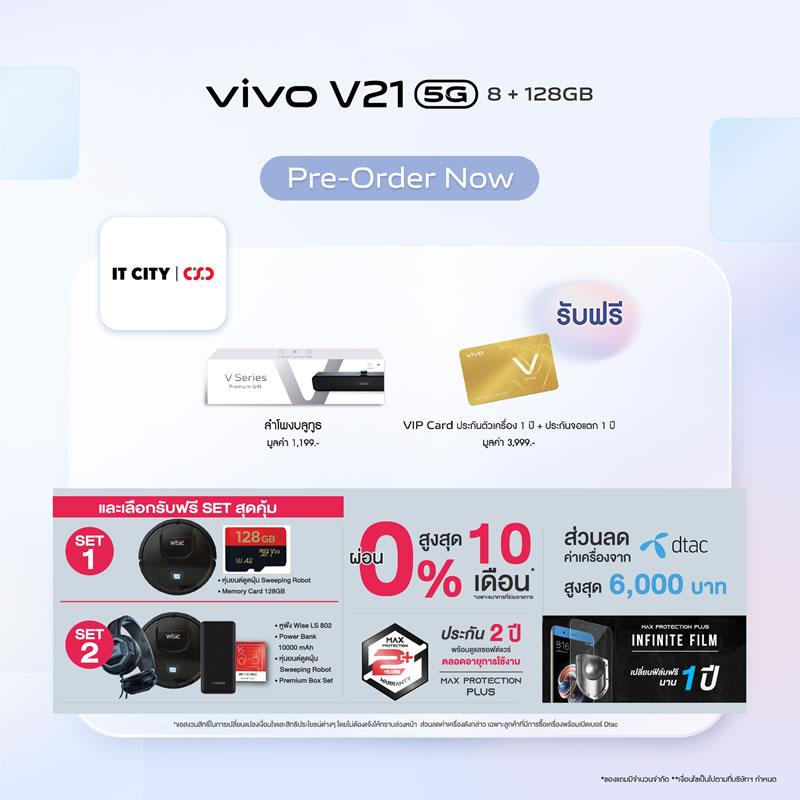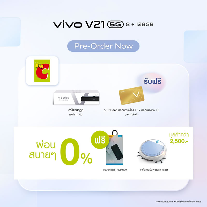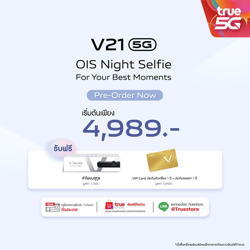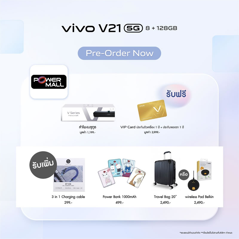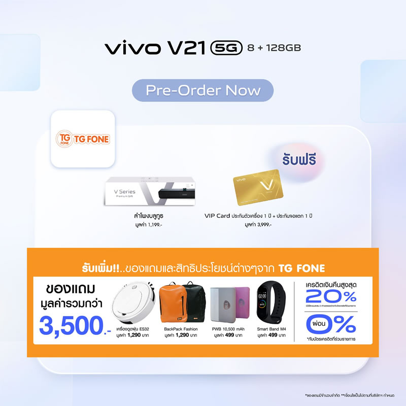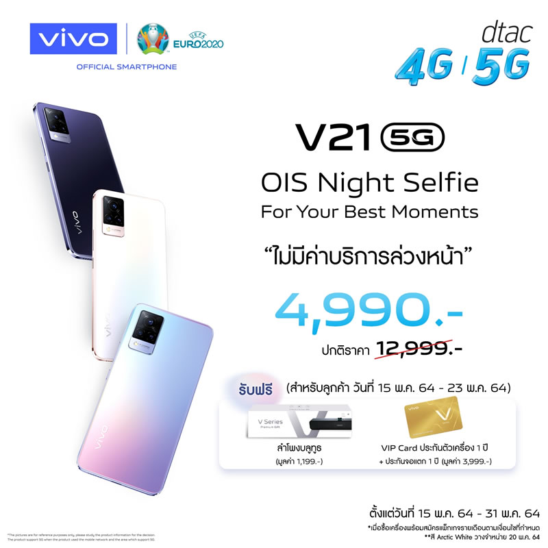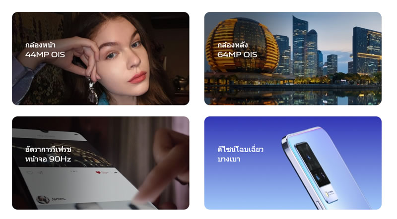Vivo ประเทศไทยเปิดจองสมาร์ทโฟนรุ่นใหม่ V21 5G อย่างเป็นทางการแล้ว ด้วยจุดเด่นที่มีกล้องหน้าเซลฟี่ความละเอียดสูงมากถึง 44 ล้านพิกเซล พร้อมระบบป้องกันภาพสั่นไหว OIS ให้การเซลฟี่ของคุณคมชัดมากยิ่งขึ้น ดังนั้นบทความนี้จะสรุปจุดเด่นกับสเปกเบื้องต้นให้ได้ทราบกัน เผื่อว่าใครกำลังอยากจับจองเป็นเจ้าของ ราคาเพียง 12,999 บาท พร้อมรับฟรี! ลำโพงบูทูธ (มูลค่า 1,199 บาท) และ VIP Card ประกันตัวเครื่อง 1 ปี รวมถึงประกันจอแตก 1 ครั้ง ภายใน 1 ปี (มูลค่า 3,999 บาท) พิเศษแบบนี้ เฉพาะลูกค้าจองเท่านั้น ดีไซน์ตัวเครื่องหรูหรา และบางเบาเช่นเดียวกับรุ่นพี่ มาพร้อมกัน 3 สี Arctic White, Sunset Dazzle และ Dusk Blue รายละเอียดเพิ่มเติม...
