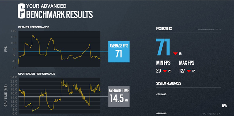 • Rainbow 6 Siege : ในเกมนี้สามารถเล่นได้ในกราฟฟิกระดับ Medium และความละเอียดเป็น HD 720p ก็สามารถทำเฟรมเรตได้ราวๆ 70fps แต่หากปรับเป็น Low จะได้เฟรมเรตราวๆ 100 เลยทีเดียว