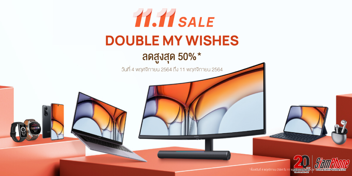 Huawei ปล่อยโปรโมชันสุดพิเศษกับเทศกาล “11.11 Sale” ครอบคลุมสมาร์ทดีไวซ์หลากหลายกลุ่มผลิตภัณฑ์ ด้วยลดสูงสุด 50% พร้อมของสมนาคุณสุดคุ้มและส่วนลดออนท็อปเพียบ สำหรับผู้ที่สั่งซื้อสินค้าผ่านทางเว็บไซต์ Huawei Store และร้านค้าอย่างเป็นทางการของหัวเว่ยใน Shopee และ Lazada ระหว่างวันที่ 4 พฤศจิกายน 2564 ถึง 11 พฤศจิกายน 2564