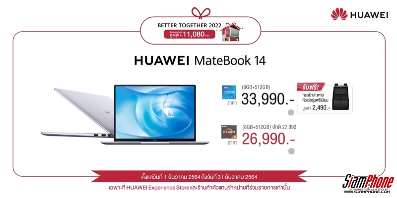 Huawei เปิดโปรเด็ดรับเดือนแห่งเทศกาลส่งมอบความสุข อยู่อย่างห่วงใยไปด้วยกัน ด้วยโปรโมชัน Better Together 2022 นำเสนอสินค้าพร้อมของสมนาคุณสูงสุด 11,080 บาทพร้อมมอบส่วนลดสุดพิเศษสำหรับผลิตภัณฑ์ชั้นนำอีกมากมาย