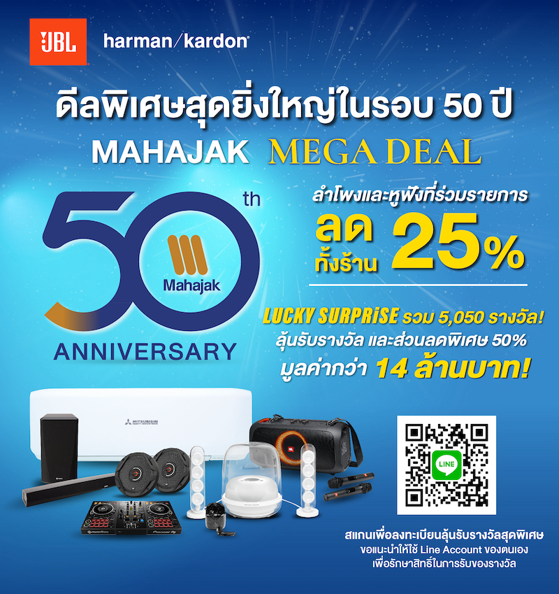 บริษัท มหาจักรดีเวลอปเมนท์ จำกัด จัดแคมเปญพิเศษฉลอง 50th Anniversary สินค้า Lifestyle Audio ทั้งหูฟัง และลำโพง JBL และ Harman Kardon ลดราคาทั้งร้าน 25% เฉพาะรุ่นที่ร่วมรายการ พิเศษ รับสิทธิ์ลุ้นรับรางวัล 5,050 รางวัล และส่วนลดพิเศษ 50% มูลค่ารวมกว่า 14 ล้านบาท