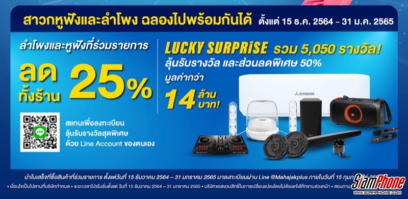 โปรโมชั่นที่ 2 ลงทะเบียนรับสิทธิ์ลุ้นชิงโชครับของรางวัล 5,050 รางวัล เมื่อซื้อสินค้าเครื่องปรับอากาศ เครื่องเสียงประเภท Lifestyle, Home, Car, Professional ลดไม่เกิน 30% ที่ร่วมรายการ พร้อมลงทะเบียน Mahajak Plus รับสิทธิ์ประกันเพิ่ม พร้อมลงทะเบียนลุ้นชิงโชค ภายในวันที่ 15 กุมภาพันธ์ 2565 เพื่อร่วมลุ้นรางวัล