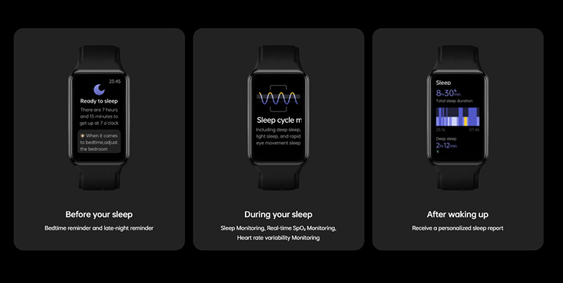 ด้านฟังก์ชั่นสุขภาพ OPPO Watch Free มีระบบ OSleep ที่จะติดตามการนอนหลับของผู้ใช้งานตั้งแต่ก่อนหน้า , ระหว่างนอน และตื่นนอน ซึ่งจะมีการแจ้งเตือนว่าถึงเวลาเข้านอน ในระหว่างนอนหลับก็มีการติดตามลักษณะการนอนหลับในแต่ละช่วงเวลา บอกค่า SpO2 และการเต้นของหัวใจแบบเรียลไทม์ เมื่อตื่นก้จะบอกข้อมูลทั้งหมดในระหว่างที่ผู้ใช้นอนหลับ