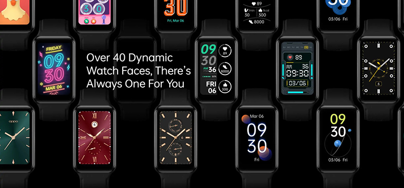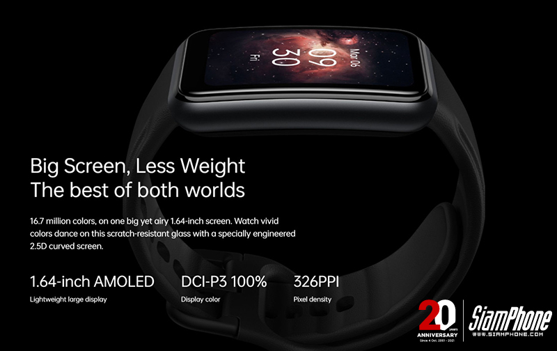 OPPO Watch Free มีตัวเรือน และหน้าปัดเป็นแบบสี่เหลี่ยม พร้อมน้ำหนักเบาเพียง 33 กรัม ส่วมใส่กับสายซลิโคนได้สบาย ส่วนหน้าจอแสดงผลเป็นจอสัมผัสพาแนล AMOLED กว้าง 1.64 นิ้ว ความละเอียด 456x280 พิกเซล ความหนาแน่นพิกเซล 326ppi แลละความกว้างของสี DCI-P3 นอกจากนี้ยังมีดีไซน์หน้าปัดแบบ Dynamic ให้เลือกกว่า 40 แบบ แต่ฟังก์ชั่นที่น่าสนใจคือ โหมดถ่ายภาพสีเสื้อ และระบบจะออกแบบดีไซน์หน้าปัดที่มีโทนสีเข้ากับเสื้อที่ใส่ ทำให้มั่นใจได้ว่า OPPO Watch Free จะมีหน้าปัดที่เข้ากับการแต่งกาย