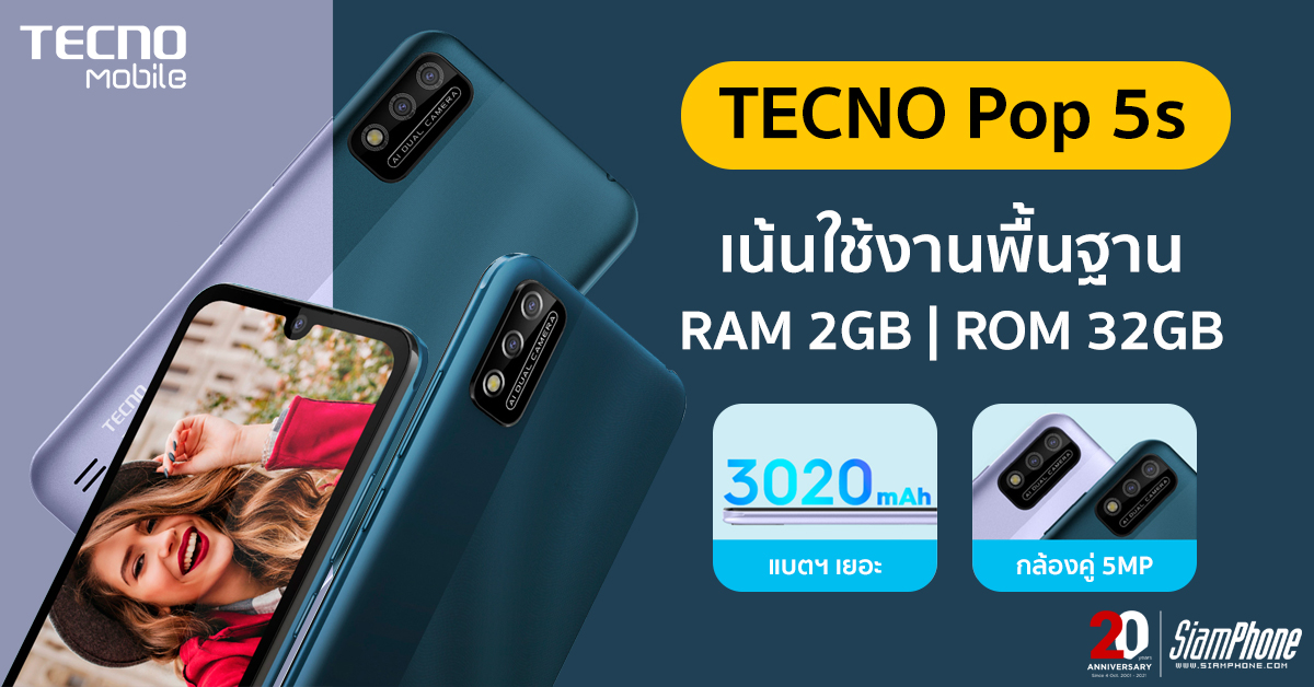 สเปคภายใน Tecno Pop 5s ขับเคลื่อนด้วยชิปเซ็ต Quad-Core (ทาง Tecno ไม่ได้บอกว่าเป็นตัวไหน แต่คาดว่าเป็น Unisoc’s SC9832E) รองรับสัญญาณ 4G ผสมกับ RAM 2GB กับ ROM 32GB สามารถเพิ่ม MicroSD Card และรันระบบปฏิบัติการเป็น Android 10 Go Edition ส่วนแบตเตอรี่มีขนาด 3,020mAh ชาร์จแบตเตอรี่ผ่านพอร์ต Micro USB และสนับสนุนช่องเสียบหูฟัง 3.5 มิลลิเมตร