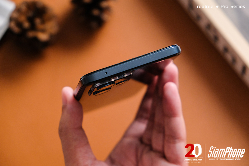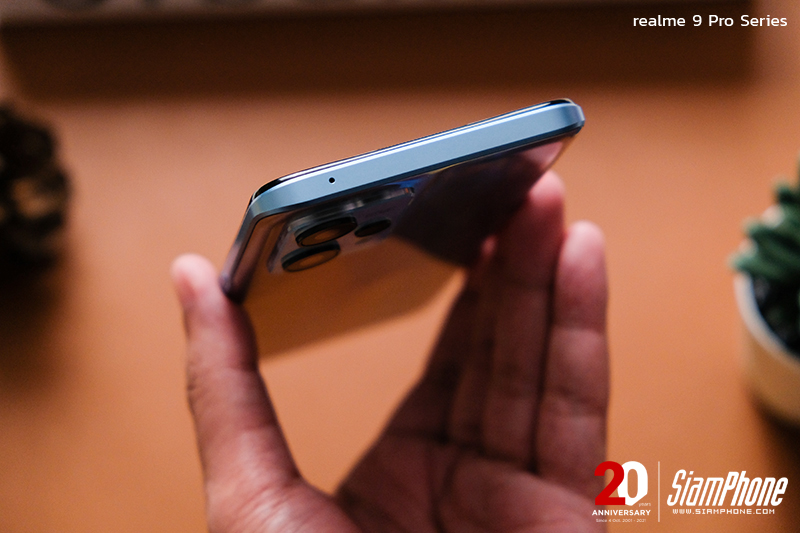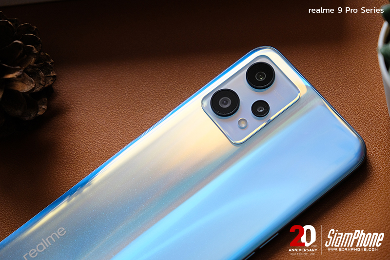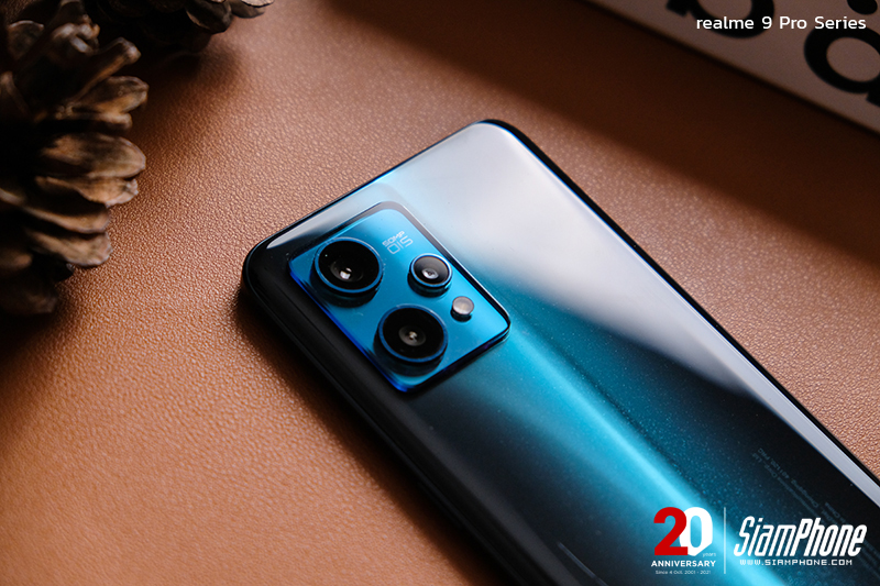 สำหรับด้านหลังของ realme 9 Pro+ ติดตั้งกล้องหลัง 3 เลนส์ ประกอบด้วย เลนส์หลักที่ใช้เซนเซอร์ Sony IMX766 ความละเอียด 50MP พร้อมระบบกันสั่น OIS + เลนส์ Ultra-Wide ความละเอียด 8MP มุมมองกว้าง 119 องศา และเลนส์ Macro ความละเอียด 2MP พร้อมไฟแฟลช จัดวางอยู่ในโมดูลกล้องทางมุมบนซ้ายของเครื่อง