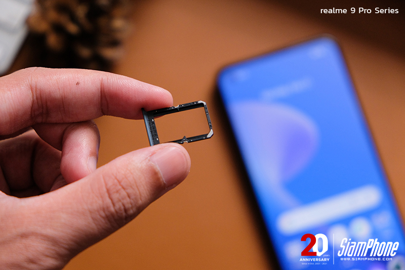 ส่วนด้านซ้าย realme 9 Pro+ มีปุ่มเพิ่มลดเสียง และถาดใส่ซิมการ์ดแบบ Nano SIM 2 ช่อง รองรับการใช้งาน 5G ไม่สามารถเพิ่มหน่วยความจำภายนอก MicroSD Card ได้ ส่วน realme 9 Pro จะมีช่องใส่ซิมแบบไฮบริด