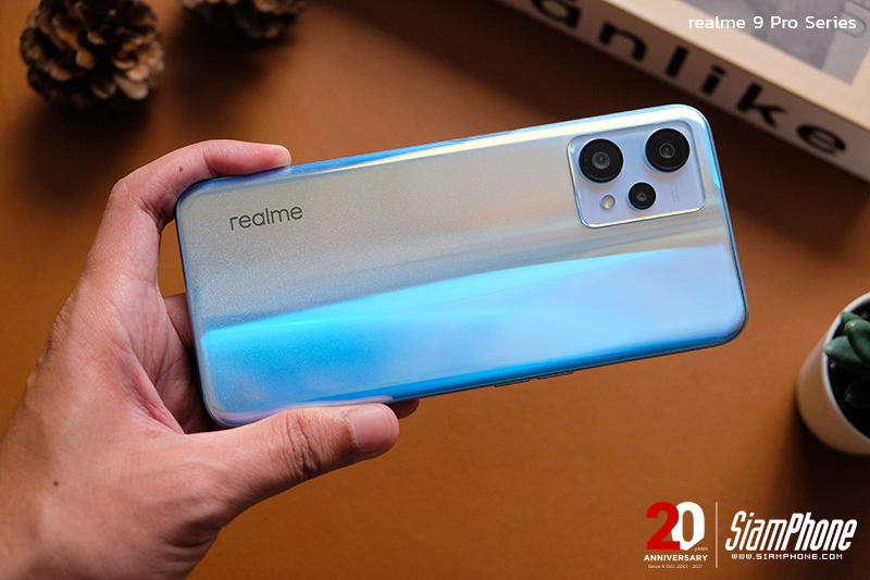 ความพิเศษของดีไซน์แบบ Photochromism ด้านหลังเครื่อง realme 9 Pro สี Sunrise Blue (เครื่องที่ได้มารีวิว) ใช้เทคนิคที่เรียกว่า Light Shift Design ซึ่งฝาหลังตัวเครื่องจะสามารถเปลี่ยนสีได้เมื่อสัมผัสโดนเข้ากับแสงแดด