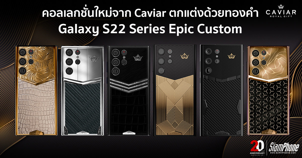 Caviar แบรนด์ผู้ผลิตสินค้าสุดหรูที่ขึ้นชื่อเรื่องวัสดุแบบพรีเมียมสัญชาติรัสเซีย เปิดจำหน่าย Samsung Galaxy S22 Series Epic Custom (Galaxy S22, Galaxy S22+, Galaxy S22 Ultra) ที่มาพร้อมกับวัสดุไทเทเนียมเกรดพรีเมียมน้ำหนักเบาและประดับตกแต่งด้วยทองคำ ซึ่งเปิดจำหน่ายให้เลือกถึง 6 รูปแบบดังนี้