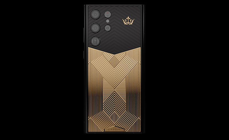 ดีไซน์ตัวเครื่องสุดหรูหรา ที่มีแรงบันดาลใจมาจากงานศิลปะในยุค 1920s-1930s พร้อมลายเส้นทรงเเรขาคณิตแบบสมมาตรบนแผ่นโลหะผสมเคลือบทอง ปิดทับด้วยรูปมงกุฎทองคำจาก Caviar