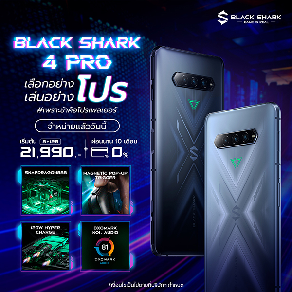 กว่าจะมาก็รอนานกันเกือบปี สำหรับ Black Shark 4 Pro ในแบบฉบับ Global โดยล่าสุดได้มีการวางจำหน่ายในประเทศไทยอย่างเป็นทางการ ผ่านร้านค้าออนไลน์อย่าง black_sharkofficial ใน Shopee Mall ซึ่งมาพร้อมของแถมมากมาย และราคาเริ่มต้นที่ 21,900 บาท