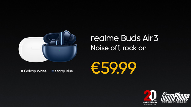 realme Buds Air 3 จะมีให้เลือก 2 สีคือ Galaxy White และ Starry Blue สนนราคาจะอยู่ราวๆ 59.99 ยูโร หรือประมาณ 2,200 บาท ส่วนการวางขายยังไม่มีข้อมูลออกมา