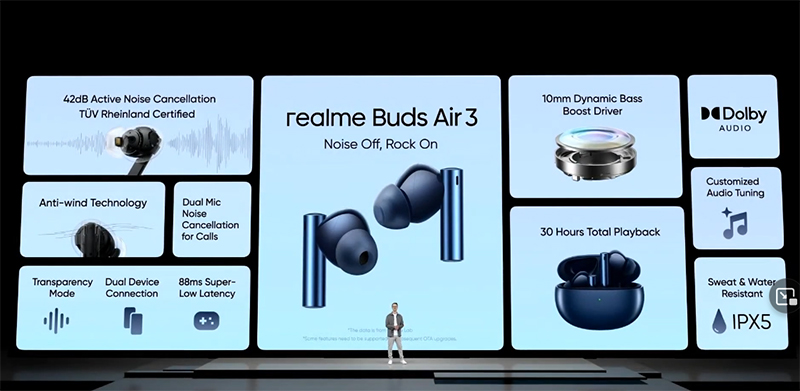 ในงาน MWC 2022 จัดขึ้นในเมืองบาร์เซโลน่า ประเทศสเปน ทาง realme ได้ทำการเปิดตัวหูฟังไร้สาย TWS รุ่นใหม่ ซึ่งเป็น realme Buds Air 3 ซึ่งมาสานต่อ realme Buds Air 2 ที่วางขายในไทยช่วงต้นปี 2021 โดย realme Buds Air 3 มีการอัปเกรดจากเดิม โดยเฉพาะระบบตัดเสียงรบกวน Noise Cancellation สามารถตัดเสียงรบกวนได้สูงถึง 42 เดซิเบล