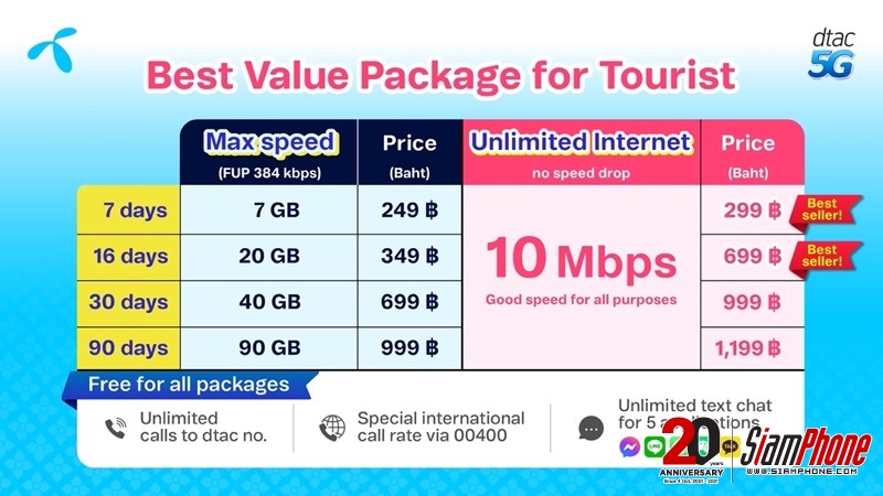 มีแพ็กเกจเริ่มต้นตั้งแต่ 3 วัน ถึง 90 วัน ให้เลือกใช้งาน นักท่องเที่ยวที่ลงเครื่องแล้ว สามารถแวะเปิดใช้บริการได้ที่ เคาน์เตอร์ดีแทค สนามบินสุวรรณภูมิ ดอนเมือง และภูเก็ต ได้ตั้งแต่วันนี้