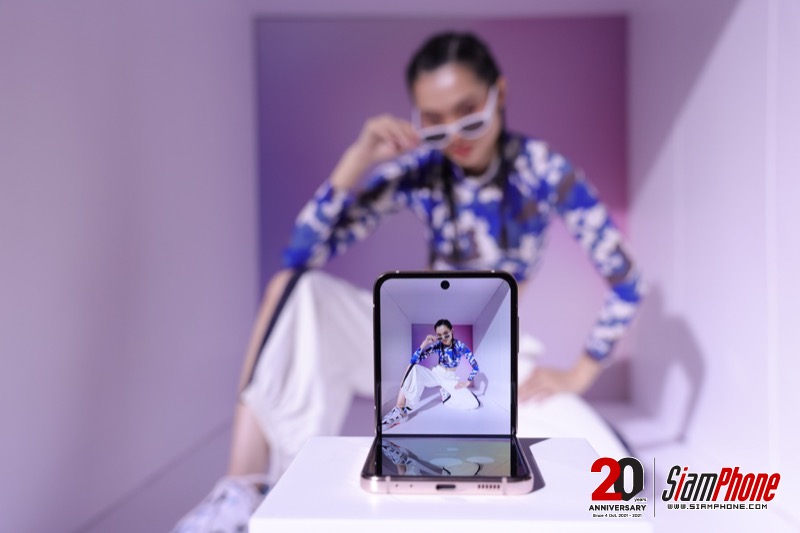 พับได้ เลยถ่ายได้ สเตชั่นถัดมา จะมีการจัดมุมถ่ายรูปมุมแปลกไว้ อย่างการถ่ายรูปในกล่อง หรือบนมุมบันได โดยจะมีนางแบบโพสต์ท่าต่างๆ และให้ถ่ายภาพ โดยใช้ Samsung Galaxy Z Flip 4 ซึ่งจะเห็นว่า รูปที่ได้ออกมาจะเป็นมุมภาพ และองศาของกล้องใหม่ๆ ที่สมาร์ทโฟนที่พับได้จะสามารถถ่ายได้เท่านั้น