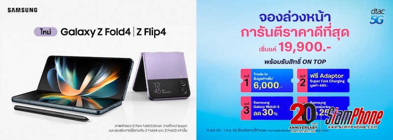 สำหรับผู้ที่สนใจ ไม่ว่าจะเป็น Samsung Galaxy Z Flip 4 และ Galaxy Z Fold 4 หรือ สมาร์ทดีไวซ์อย่าง Galaxy Watch 5 series และ Galaxy Buds 2 Pro สามารถร่วมจับจองเป็นเจ้าของได้ก่อนใคร ผ่านการสั่งซื้อล่วงหน้า พร้อมโปรโมชั่นสุดพิเศษจากซัมซุงและ พาร์ทเนอร์อย่าง AIS, TRUE และ DTAC ตั้งแต่วันนี้ - 1 กันยายน 2565 โดยจะวางจำหน่ายอย่างเป็นทางการในวันที่ 2 กันยายน 2565 นี้