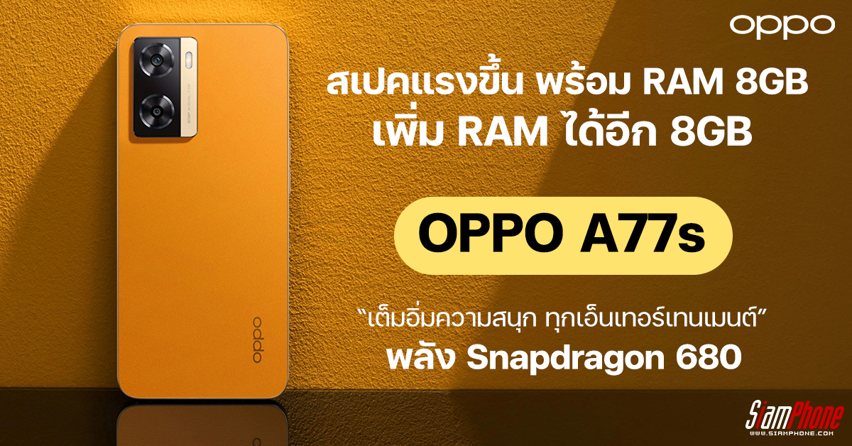 OPPO A77s ปล่อยอัปเดตซอฟแวร์เวอร์ชันใหม่ มาพร้อมสเปกแรงยิ่งขึ้น เพิ่มฟังก์ชัน Ram Expansion ได้มากกว่าเดิม เพิ่มหน่วยความจำได้อีก 8GB ในราคาเพียง 8,999 บาท ตั้งแต่วันที่ 27 ตุลาคม 2565 เป็นต้นไป สามารถดู รีวิว OPPO A77s ตัวเต็มได้ที่ลิงก์นี้เลย >> https://siamph.co/94th6