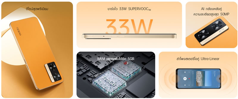 โดดเด่นเป็นเอกลักษณ์ด้วยฝาหลังดีไซน์หนังไฟเบอร์กลาสขอบเหลี่ยมสุดคลาสสิกในรุ่นสีส้ม Sunset Orange และสวยเป็นประกายด้วยดีไซน์ OPPO Glow ในรุ่นสีดำ Starry Black วางจำหน่ายในราคา 8,999 บาท สามารถเป็นเจ้าของได้แล้ววันนี้ ที่ OPPO Brand Shop และตัวแทนจำหน่ายที่ร่วมรายการ