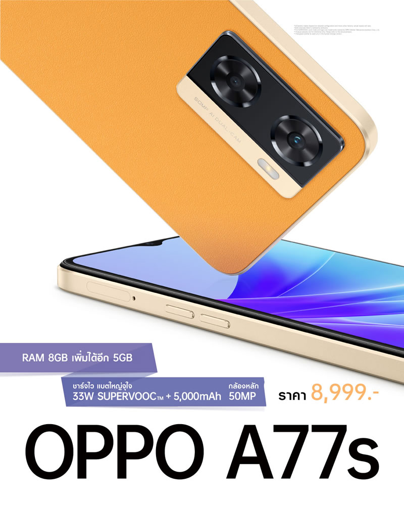OPPO A77s ให้คุณ “เต็มอิ่มความสนุก ทุกเอ็นเทอร์เทนเมนต์” ด้วย RAM 8GB + ROM 128GB พร้อมเพิ่ม RAM ได้มากถึง 8GB ใช้งานได้ยาวนานตลอดวันด้วยแบตเตอรี่ขนาดใหญ่ 5,000mAh เสริมด้วย ชาร์จไว 33W SUPERVOOC พร้อมถ่ายภาพบุคคลสวยด้วยกล้องหลัก 50MP พร้อมฟีเจอร์ Bokeh Flare Portrait ให้พื้นหลังละลายดวงไฟโบเก้ และถ่ายภาพคนสวยเป็นธรรมชาติ ใช้งานเร็วแรงด้วยขุมพลัง Qualcomm Snapdragon 680