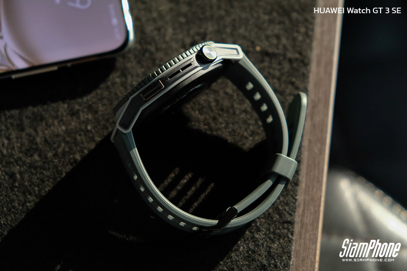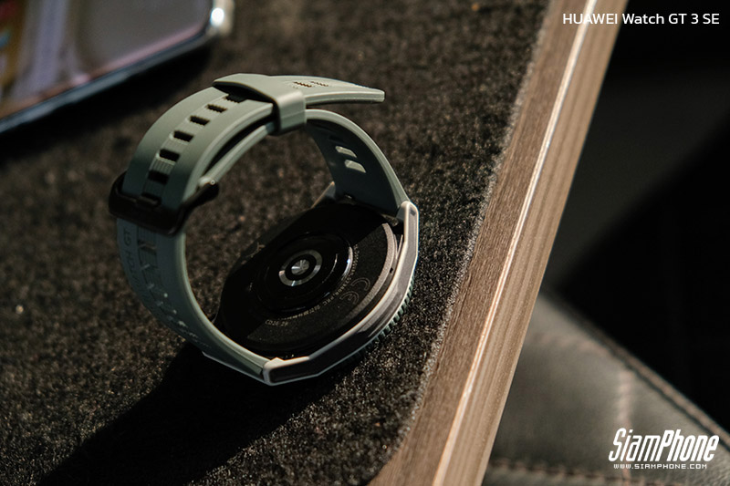 HUAWEI Watch GT 3 SE ตัวเรือนใช้วัสดุ Polymer Fiber แบบทนทาน ซึ่งมีความเบาเพียง 35.6 กรัม (ไม่รวมสาย) สวมใส่เป็นสบาย แต่ยังให้ความแข็งแกร่งอยู่ และตัวเรือนยังมีความบางเหมาะกับการใช้งานแบบลุยๆ ส่วนดีไซน์ตัวเรือนเป็นแบบทรงกลม ด้านหลังตัวเรือนมีเซนเซอร์ตรวจจับความเปลี่ยนแปลงของร่างกาย ซึ่งเป็นไฟสีเขียว