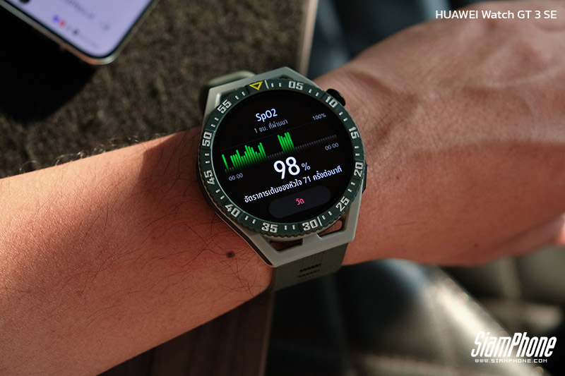 วัดค่า SpO2 : HUAWEI Watch GT 3 SE มาพร้อมโหมดวัดค่าออกซิเจนในเลือดอย่าง SpO2 ซึ่งใส่ และใช้วัดค่าได้ตลอดเวลา เมื่อเริ่้มการวัดค่า ผู้ใช้งานต้องทำข้อมือในนิ่งๆ จึงสามารถวัดได้ ซึ่งผลที่ออกมาจะเป็น % หากมี % ที่ต่ำเกินไปถือว่าร่างกายผิดปกติ ควรไปพบแพทย์อีกครั้ง