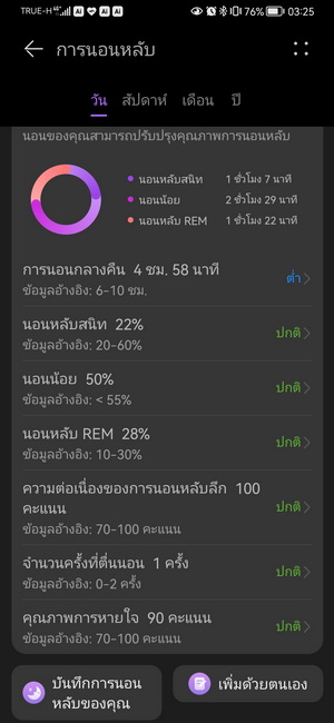 HUAWEI TruSleep 3.0 : นี้คือโหมดติดตามการนอนหลับ เมื่อหลับ และใส่ HUAWEI Watch GT 3 SE ไปด้วย ระบบจะเริ่มทำงานให้แบบอัตโนมัติ ซึ่งมีการวิเคราะห์พฤติกรรมการนอนหลับในแต่ละช่วงเวลาให้ โดยแบ่งเป็น การกลับลึก, หลับปกติ, REM, และตื่นนอน
