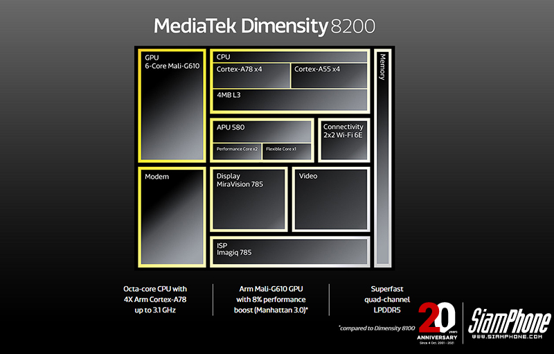 MediaTek Dimensity 8200 คอร์ภายในยังเป็นแบบ Octa-Core แต่จะมี 1 Core ใหญ่ Cortex-A78 ความเร็วสูงถึง 3.1GHz ซึ่งเป็นรุ่นแรกในซีรี่ย์นี้ที่จะมีคอร์ใหญ่มาด้วย ส่วนอีก 3 คอร์มีไว้สำหรับประสิทธิภาพ ความเร็ว 3.0GHz และอีก 4 คอร์เป็น Cortex-A55 ความเร็ว 2.0GHz สำหรับประหยัดพลังงาน