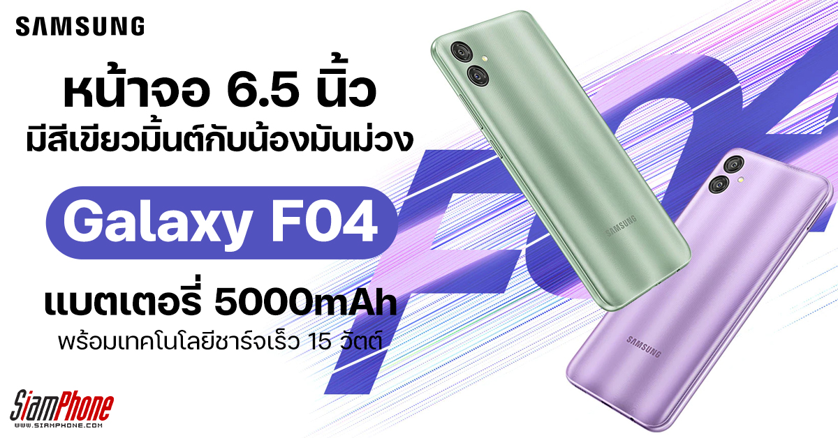 Samsung เปิดตัวสมาร์ทโฟนรุ่นใหม่ Samsung Galaxy F04 ที่เป็นการผสมผสานความเป็นแฟชั่นและความคุ้มค้าเข้าด้วยกัน โดยเฉดสีตัวเครื่องใช้เป็นเฉดสีที่ยอดนิยม มินิมอล โดดเด่น ได้แก่สีเขียวมิ้นต์และสีน้องมันม่วง พื้นผิวมีลักษณะเงา สะท้อนแสงเป็นสีมุมมองใหม่ๆ อย่างลงตัว มาพร้อมการอัปเดต OS นาน 2 ปี ทำให้แอนดรอยด์ของคุณทันสมัย ด้านการใช้งานก็เร็วแรงด้วย RAM สูงสุด 8GB จากสเปคเครื่อง 4GB และฟีเจอร์สร้าง RAM เสมือนอีก 4GB ด้านแบตเตอรี่มีความจุ 5000mAh พร้อมเทคโนโลยีชาร์จเร็ว 15 วัตต์ รายละเอียดเพิ่มเติมดังนี้...