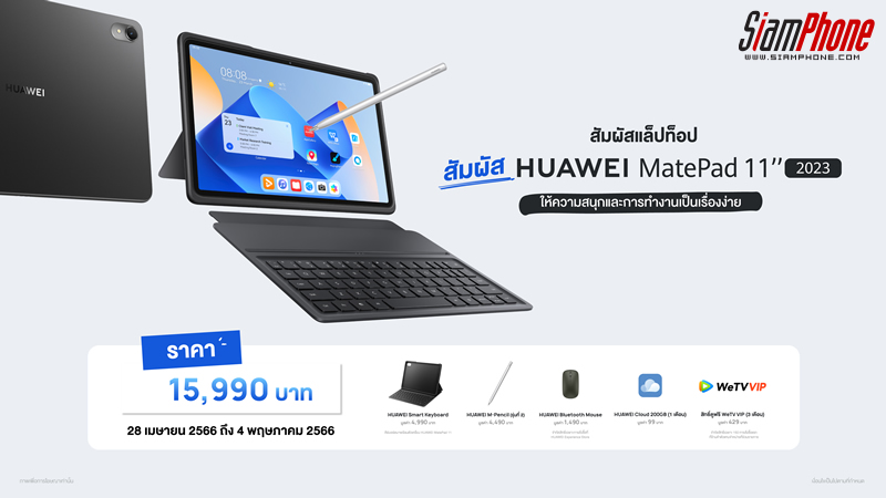 สำหรับใครที่เป็นสายชอบจดโน้ตบอกเลยห้ามพลาด สัมผัสการทำงานแบบอัปเกรดไปกับ HUAWEI Notes ใน HUAWEI MatePad 11 2023 WIFI 6+128GB วางจำหน่ายในราคา 15,990 บาท เปิดให้พรีออเดอร์เร็วๆ นี้ ระหว่างวันที่ 28 เมษายน 2566 ถึงวันที่ 4 พฤษภาคม 2566 รับฟรี! HUAWEI Smart Keyboard มูลค่า 4,990 บาท ปากกา HUAWEI M-Pencil 2nd generation มูลค่า 4,490 บาท และสิทธิพิเศษจากแอปฯ ต่างๆ ได้แก่ HUAWEI Cloud 1 เดือน (200GB) มูลค่า 99 บาท และ WeTV VIP 3 เดือน มูลค่า 429 บาท มูลค่ารวม 11,498 บาท พิเศษ! รับ HUAWEI Bluetooth Mouse มูลค่า 1,490 บาท เมื่อสั่งจองผ่าน HUAWEI Experience Store ที่ร่วมรายการเท่านั้น สามารถติดตามรายละเอียดโปรโมชันอื่นๆ ได้ทาง Huawei Mobile TH และเตรียมกดสั่งซื้อผลิตภัณฑ์ได้ที่นี่