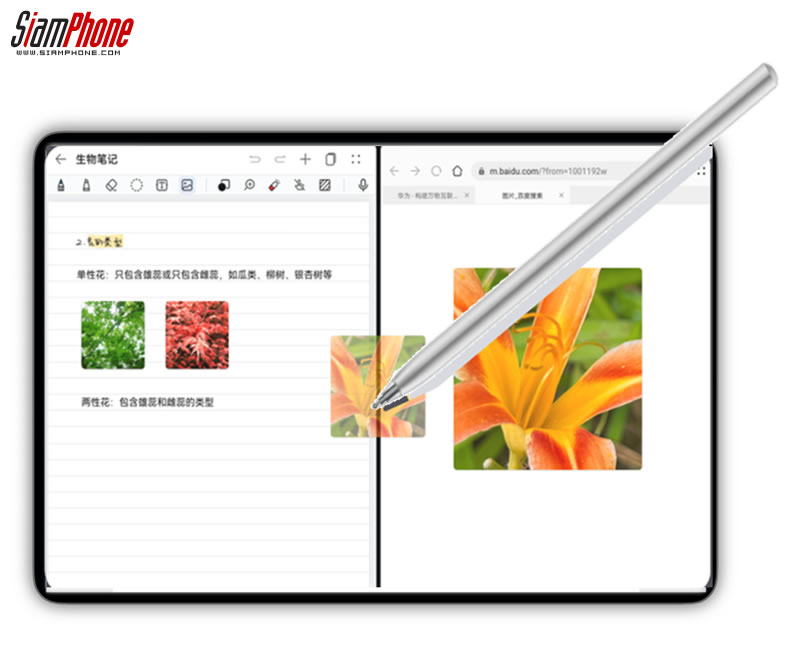 ทำงานร่วมกับปากกา HUAWEI M-Pencil 2nd generation ในการเขียนข้อความ ตัดภาพเฉพาะส่วนด้วยฟีเจอร์ Take Snippet และออกแบบเลคเชอร์เลือกการไดคัทภาพแล้วสามารถใช้ปากกาเคลื่อนยายภาพประกอบกันได้อย่าง เพิ่มสีสันของโน้ตได้อย่างไร้ขีดจำกัดด้วยความสามารถในการดูดสีได้จากทั้งภาพถ่ายจริงและดูดสีข้ามแอปพลิเคชันได้ด้วยฟีเจอร์ Cross-app Colour เพิ่มความสะดวกระหว่างการขีด เขียน เมื่อเราเขียนผิดวาดผิด ไม่ต้องเข้าฟังก์ชันอื่นๆ เปลี่ยนเป็นยางลบ แค่กดค้างไว้ที่หน้าจอก็สามารถ เปลี่ยนปากกาเป็นยางลบแล้วลบสิ่งที่ต้องการได้