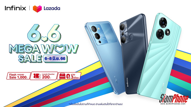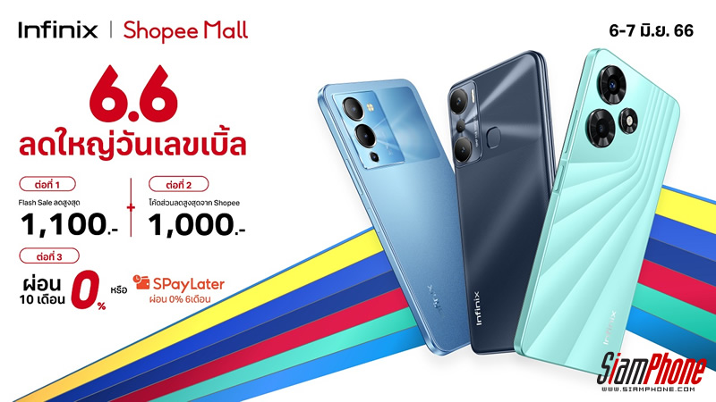 อินฟินิกซ์ (Infinix) ต้อนรับมหกรรมช้อปปิ้งออนไลน์สุดยิ่งใหญ่กลางปี จัดเต็มโปรดีในช่วงเวลา Flash Sale ผ่านแคมเปญ 6.6 กับกองทัพสมาร์ทโฟนรุ่นเด็ดยอดนิยม ที่ลดราคากันแบบจุใจ ด้วยส่วนลดสูงสุดถึง 1,100 บาท พร้อมเสิร์ฟความคุ้มค่าด้วยสิทธิประโยชน์มากมาย ที่ให้ลูกค้าเป็นเจ้าของมือถือได้ในราคาที่ดีที่สุด พร้อมยังมอบดีลเด็ด จัดส่งฟรีและข้อเสนอพิเศษผ่อน 0% สูงสุดนาน 10 เดือน* เมื่อซื้อสินค้าที่ร่วมรายการ โดยสามารถซื้อสินค้าได้ที่ร้าน Infinix Official Store บน Shopee, Lazada และ TikTok