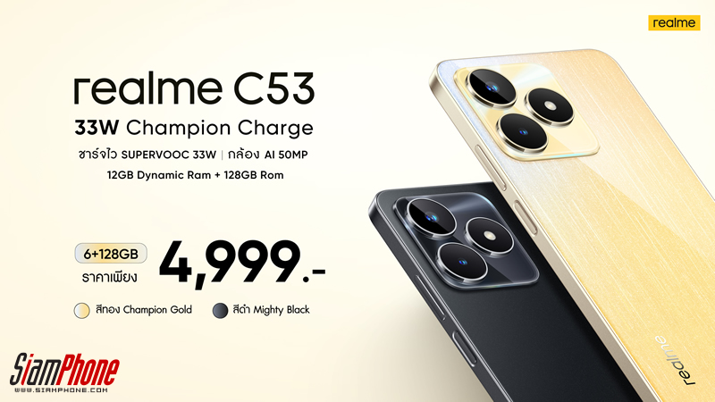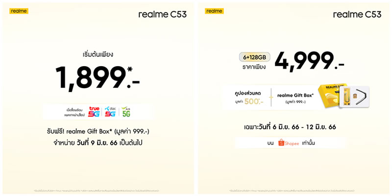 realme C53 วางจำหน่ายรุ่นความจุ 6+128GB ในราคา 4,999 บาท เลือกได้ทั้งโทนสี Champion Gold และ Mighty Black ช่องทางการสั่งซื้อสำหรับช่องทาง Shopee : https://shope.ee/6fCOz6qTYt