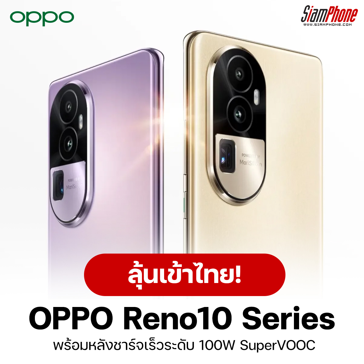 สำหรับ OPPO Reno10 Series ที่เปิดตัวในประเทศจีนไปก่อนหน้า จะมีด้วยกัน 3 รุ่นคือ OPPO Reno10 Pro+, OPPO Reno10 Pro และ OPPO Reno10 โดยมีความโดดเด่นที่หน้าจอ OLED อัตรา Refresh Rate สูงสุด 120Hz เปิดประสบการณ์ถ่ายรูปด้วยชิป NPU อย่าง MariSilicon X (รุ่นเล็กสุดไม่มี) พร้อมหลังชาร์จเร็วระดับ 100W SuperVOOC (รุ่นเล็กสุดชาร์จเร็ว 80W)