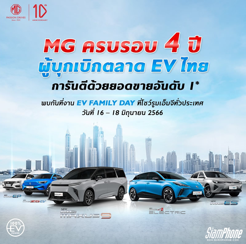 บริษัท เอสเอไอซี มอเตอร์ – ซีพี จำกัด และ บริษัท เอ็มจี เซลส์ (ประเทศไทย) จำกัด ผู้ผลิตและผู้จำหน่ายรถยนต์เอ็มจีในประเทศไทย ตอกย้ำการเป็นผู้บุกเบิกตัวจริงของตลาดอีวีในไทย ยกระดับเดือนมิถุนายน สู่ “เดือนแห่งอีวี” ฉลองครบรอบ 4 ปี ในการแนะนำ “รถอีวี” ให้คนไทยเข้าถึงรถยนต์ไฟฟ้าได้ง่าย ด้วยกิจกรรม EV FAMILY DAY พร้อมมอบแคมเปญดอกเบี้ยพิเศษ และตรวจเช็กรถยนต์ไฟฟ้าฟรี 34 รายการ สำหรับลูกค้า เอ็มจี ตลอดทั้งเดือน เพื่อสร้างความมั่นใจให้กับลูกค้าที่จะก้าวมาเป็น EV FAMILY กับ เอ็มจี