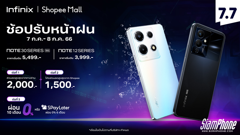 อินฟินิกซ์ (Infinix) แบรนด์สมาร์ทโฟนราคาคุ้มค่า ครบครันทุกการใช้งาน และตอบโจทย์ไลฟ์สไตล์คนรุ่นใหม่ รวมโปรโมชันดี ดีลปัง 7.7 เอาใจขาช้อปออนไลน์และผู้ใช้งานทุกคน ให้สามารถเป็นเจ้าของสมาร์ทโฟนตัวท็อปรุ่นฮิตในราคาที่ดีที่สุด คุ้มที่สุด อาทิ NOTE 30 Series, NOTE 12 Series, HOT 30 Series, HOT 20 Series และ SMART 7 ด้วยการมอบส่วนลดสูงสุด 2,000* บาท พร้อมรับข้อเสนอพิเศษผ่อน 0% นาน 10 เดือน* เมื่อซื้อสินค้าที่ร่วมรายการ โดยสามารถซื้อสินค้าได้ที่ร้าน Infinix Official Store บน Shopee, Lazada และ Tiktok Shop