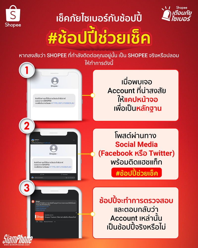 เปิดแคมเปญช้อปปี้เตือนภัยไซเบอร์ ในความร่วมมือกับคณะทำงานสร้างเสริมภูมิคุ้มกันภัยอาชญากรรมทางเทคโนโลยี สำนักงานตำรวจแห่งชาติ ด้วยตระหนักถึงภัยบนโลกออนไลน์ในปัจจุบัน จึงเป็นที่มาของการริเริ่มแคมเปญ ‘ช้อปปี้เตือนภัยไซเบอร์’ โดยถือเป็นส่วนหนึ่งของโปรแกรม ‘Shop Safe with Shopee ช้อปปลอดภัยกับช้อปปี้’ เพื่อมุ่งส่งเสริมการรับรู้ถึงความเสี่ยงที่อาจเกิดขึ้นบนโลกออนไลน์ และเพื่อรวบรวมข้อมูลความรู้เกี่ยวกับเรื่องความปลอดภัยทางออนไลน์ที่เป็นประโยชน์เพื่อให้ผู้คนสามารถเข้าถึงข้อมูลได้อย่างสะดวกผ่านไมโครไซต์ https://shopee.co.th/m/shopee-cyber-crime-alert