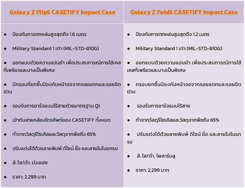 CASETiFY (เคสทิฟาย) ประกาศเปิดตัวซีรีส์เคสกันกระแทกสำหรับ Samsung Galaxy Z Flip5 และ Galaxy Z Fold5 รวมถึงซีรีส์ Flexi Band สำหรับ Galaxy Watch 6 แบบทันควัน เอาใจชาวซัมซุงให้ได้ตกแต่งมือถือรุ่นใหม่ พร้อมการป้องกันที่แข็งแกร่ง ทนต่อการตกจากที่สูงสุดถึง 1.6 เมตร มาตรฐาน Military Standard 1 เท่า (MIL-STD-810G) น้ำหนักเบาแต่ยังคงทน มีให้เลือกหลากหลายสไตล์ วางจำหน่ายแล้วตั้งแต่วันนี้บน CASETiFY.com และ Pop up store @CentralWorld ในราคา 2,299 บาท