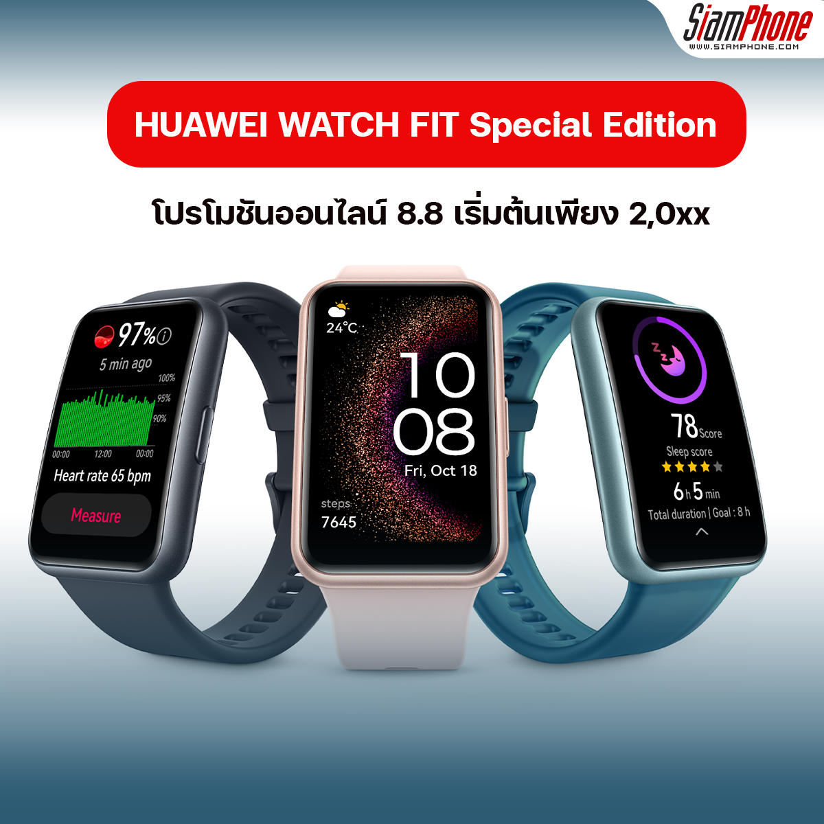 วันนี้แล้วกับโปรโมชันออนไลน์ 8.8 กดสั่งซื้อได้เลยกับ HUAWEI WATCH FIT Special Edition สมาร์ทวอทช์หน้าจอ AMOLED 1.64 นิ้ว รองรับภาษาไทยพร้อมเทคโนโลยีชั้นนำตรวจวัดค่าสำคัญทั้งสุขภาพและการออกกำลังกายกว่า 100 โหมด ราคาเพียง 2,699 บาท พร้อมของแถมจัดเต็มเมื่อซื้อสินค้าผ่านช่องทาง HUAWEI Store และร้านค้าอย่างเป็นทางการของหัวเว่ยบนแอปพลิเคชัน Lazada และ Shopee