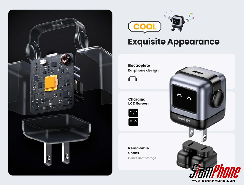 การออกแบบหน้าตาหุ่นยนต์ไม่ได้มีไว้สำหรับโชว์เท่านั้น Ugreen Nexode RG GaN มีหน้าจอ LED Mini Smart ที่แสดงสถานะการชาร์จได้อย่างรวดเร็วโดยไม่ต้องดูอุปกรณ์ที่ชาร์จแต่ละเครื่อง ใบหน้าของหุ่นยนต์บอกทุกอย่าง โดยแสดงรอยยิ้มที่มั่นใจเมื่ออุปกรณ์ชาร์จเต็มแล้ว