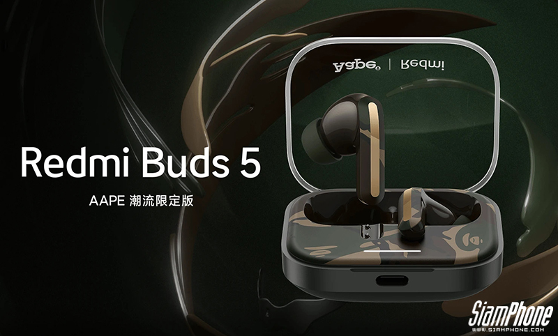 Redmi Buds 5 ยังมีรุ่นพิเศษ ด้วยการจับมือกับแบรนด์เสื้อผ้าอย่าง AAPE พร้อมออกแบบดีไซน์ใหม่เป็นลวดลายทหาร และมีราคาที่สูงขึ้น