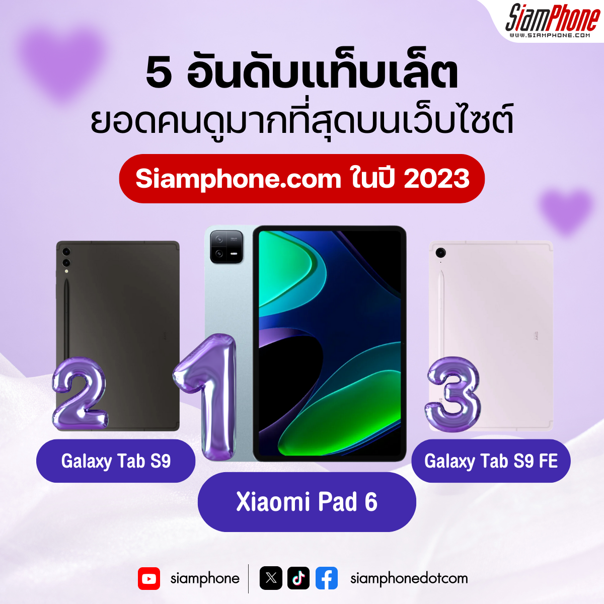 ในปี 2023 สาขาแท็บเล็ตกลับมาดูคึกคักอีกครั้ง เพราะการใช้งานที่ตอบโจทย์คนยุคใหม่ พกพาได้ง่าย มีอุปกรณ์เสริมใช้งานได้เหมือน PC และมีฟีเจอร์ที่ช่วยให้ทำงานร่วมกับอุปกรณ์อื่นได้สะดวกมากขึ้น ทำให้แท็บเล็ตเป็นอีกอุปกรณ์ที่คนส่วนใหญ่ เลือกใช้งานแทนแล็ปท็อปมากขึ้นในปี 2023 ทีนี่มาดูกันดีกว่าว่า 5 อันดับแท็บเล็ต ยอดคนดูมากที่สุดบนเว็บไซต์ Siamphone.com ในปี 2023 จะมีรุ่นอะไรบ้าง