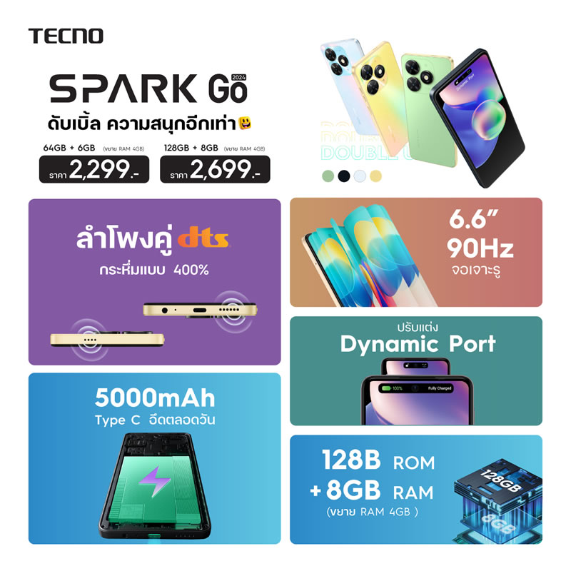 TECNO ประเทศไทยวางจำหน่ายสมาร์ทโฟนรุ่นใหม่ TECNO SPARK GO 2024 พร้อมสเปคจัดเต็มราคาประหยัดเอามากๆ ไม่ถึงสามพันบาท ไฮไลท์น่าสนใจ ไม่ใช่สินค้าตามราคา เพราะดีไซน์การออกแบบ เรียกได้ว่าทาง TECNO ใส่ใจมากๆ ด้วยเทคนิคการออกแบบเฉพาะที่ให้ความรู้สึกพรีเมียม สวยงาม เมื่อเทียบกับรุ่นอื่นในช่วงราคาเดียวกัน มาพร้อมหน้าจอขนาด 6.6 นิ้ว แบบ 90Hz โดยมีฟีเจอร์ Dynamic Port ที่จะแสดงสถานะต่างๆ ของตัวเครื่อง รวมถึงการแจ้งเตือนให้ผู้ใช้งานได้ทราบ บริเวณด้านบนหน้าจอ ซึ่งผู้ใช้ไม่ต้องปลดล็อคตัวเครื่อง หรือเรียกใช้งานเปิดแอปฯ นั้นมาดู ทุกข้อมูลจะถูกแสดงอย่างย่อให้เห็นในฟีเจอร์ดังกล่าว