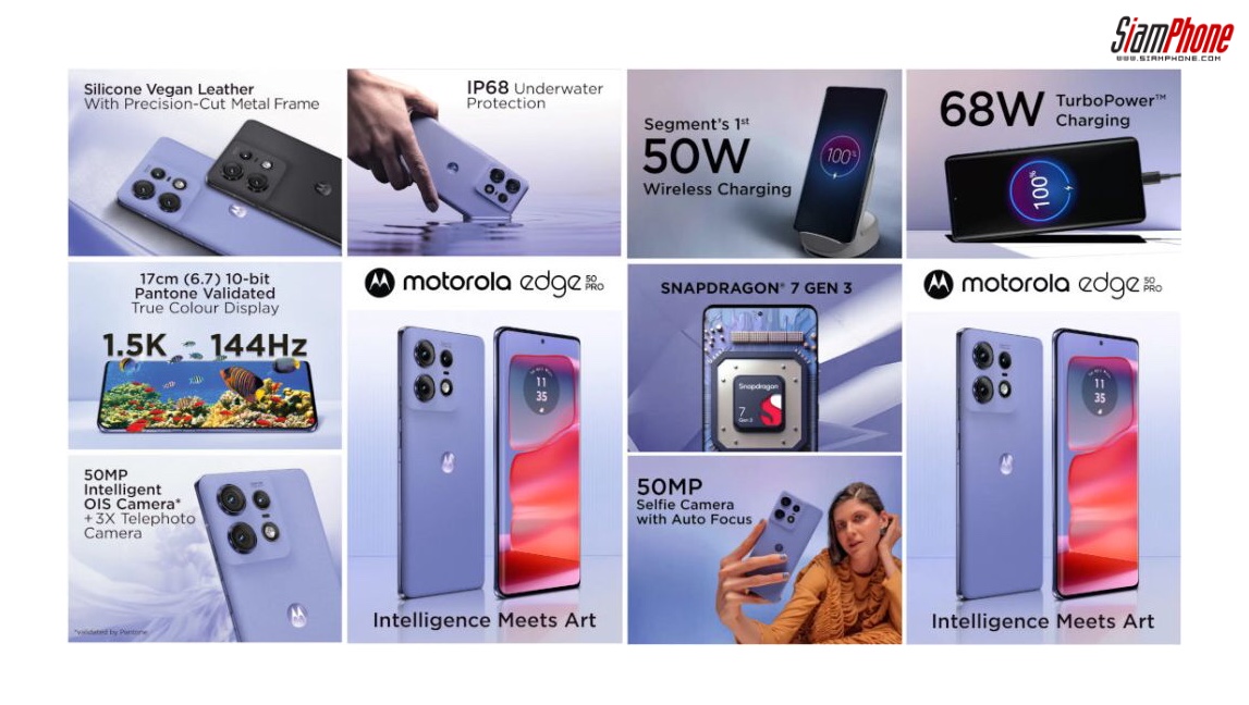 motorola เพิ่งเปิดตัว motorola edge 50 Pro สมาร์ทโฟนรุ่นล่าสุดจาก edge 50 Series แล้วในประเทศอินเดีย มาพร้อมหน้าจอ pOLED โค้ง ขนาด 6.7 นิ้ว ความละเอียด 1.5K รองรับอัตรารีเฟรชเรตสูงสุด 144Hz เป็นสมาร์ทโฟนเครื่องแรกของโลกที่ได้รับการรับรองมาตรฐานด้านสีโดย Pantone ความสว่างสูงสุด 2000 nits รองรับ HDR 10+ และป้องกันด้วยกระจก Corning Gorilla Glass 5