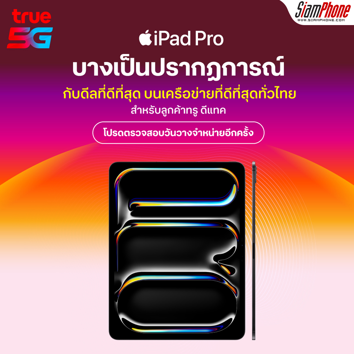 ทรู 5G เตรียมวางจำหน่าย iPad Pro รุ่นใหม่ ที่มีดีไซน์ที่บางเบาเป็นปรากฎการณ์และดีไซน์สวยสะดุดตา พร้อมด้วยหน้าจอสุดล้ำ Ultra Retina XDR และชิป M4 ที่ทรงพลังและมีความเร็วที่สูงสุด พร้อมสำหรับ AI
