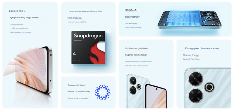 Redmi อัปเกรดสมาร์ทโฟนรุ่นเดิมในซีรีส์เก่า พร้อมเปลี่ยนชื่อรุ่นใหม่ Redmi Note 13R มีการเปลี่ยนแปลงเล็กน้อย คือ ชิปเซ็ตประมวลผลกับดีไซน์ที่พรีเมียมมากยิ่งขึ้นในคอนเซ็ปต์ Crystal Glass Design เป็นแนวคิดการออกแบบของแสงที่ตกกระทบกระจก เกิดเป็นวงคลื่นแตกต่างกันไป มี 3 เฉดสีให้เลือก ได้แก่ Ice Crystal Blue, Silver และ Midnight Black โดยมีคุณสมบัติป้องกันน้ำป้องกันฝุ่น IP53 เช่นกัน อีกจุดที่มีการเปลี่ยนแปลงคือ การใช้ชิปเซ็ตที่ถูกพัฒนาใหม่โดยเฉพาะ Snapdragon 4 Gen 2 Advanced Edition เรียกได้ว่าใช้งานเร็วแรงมากยิ่งขึ้น อย่างไรก็ตามบางสเปคก็มีปรับลดลงด้วย เมื่อเทียบกับ Redmi Note 13 5G