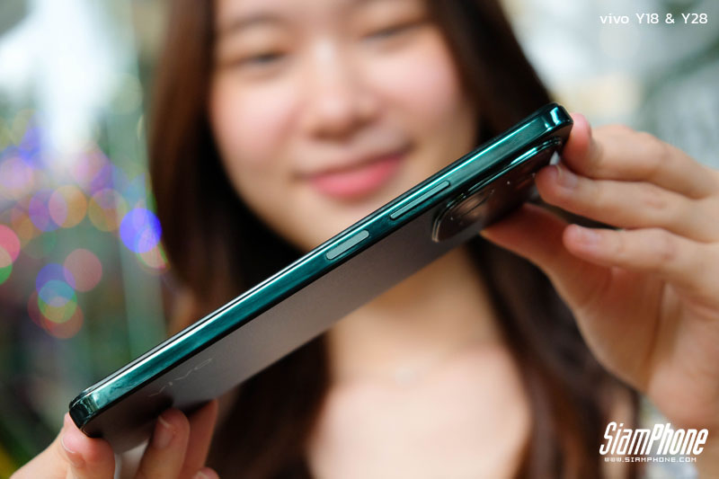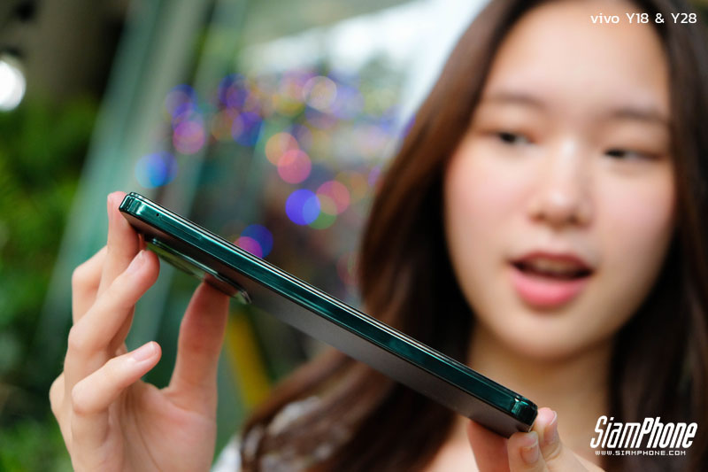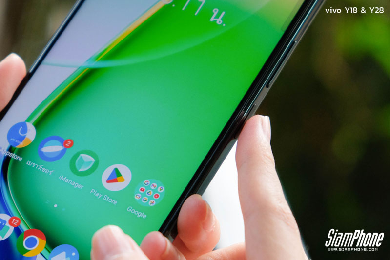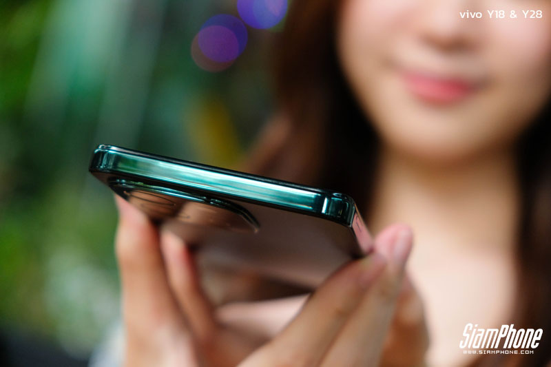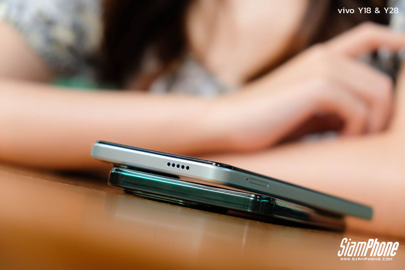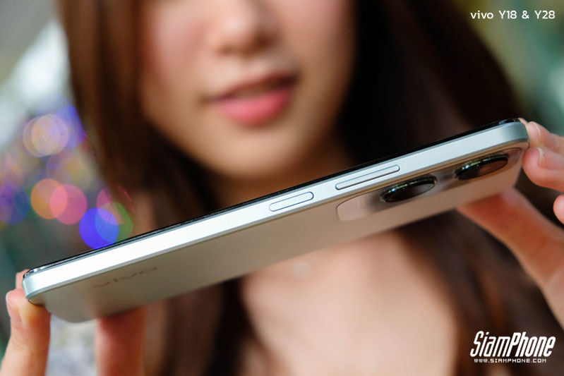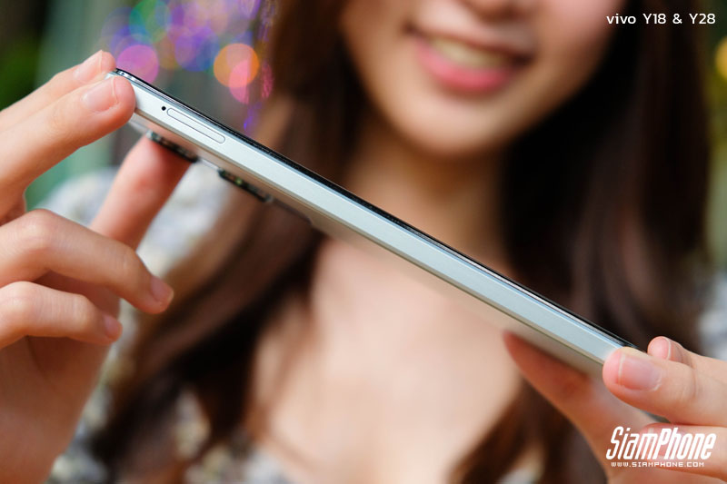 ด้านซ้ายตัวเครื่องมีช่องใส่ซิมการ์ด โดย vivo Y18 ถาดซิมการ์ดเป็นแบบ Triple-Slot ใส่ได้สองซิมการ์ดและหน่วยความจำภายนอก MicroSD Card 1TB ส่วนรุ่นพี่ vivo Y28 เป็นแบบ Hybrid คงต้องเลือกว่าจะใส่อย่างไร