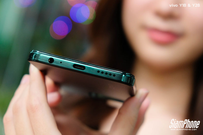 ด้านล่างตัวเครื่องของสมาร์ทโฟน vivo Y28 มีช่องลำโพงเพิ่มขึ้นมา, พอร์ต USB Type-C สำหรับชาร์จแบตเตอรี่และถ่ายโอนข้อมูล, รูไมโครโฟนตัดเสียงรบกวน และช่องเสียบหูฟังขนาด 3.5 มิลลิเมตร