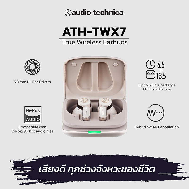 บริษัท อาร์ทีบี เทคโนโลยี จำกัด ตัวแทนจำหน่ายสินค้าภายใต้แบรนด์ Audio-Technica (ออดิโอ เทคนิก้า) เปิดตัวหูฟังรุ่นใหม่ล่าสุด ATH-TWX7 หูฟังอินเอียร์ไร้สายขนาดกะทัดรัดที่ได้รับการออกแบบมาให้พอดีกับหูของคุณ มาพร้อมเทคโนโลยีตัดเสียงรบกวนแบบดิจิทัลไฮบริด ช่วยตัดเสียงรบกวนภายนอกได้อย่างมีประสิทธิภาพ ผสานการทำงานร่วมกับระบบ Ambience Control (การตัดเสียงรบกวน, การรับเสียงภายนอก, การสนทนา) ช่วยให้คุณเพลิดเพลินกับเสียงเพลงและการสนทนาได้อย่างเต็มที่ ไดร์เวอร์ความละเอียดสูงขนาด 5.8 มม. ช่วยขยายความกว้างของช่วงเสียงและปรับปรุงรายละเอียดของเสียงให้ดียิ่งขึ้น รวมถึงรองรับระบบเสียง LDAC Codec ช่วยให้คุณสามารถเล่นไฟล์เสียง 24-bit/96 kHz ได้