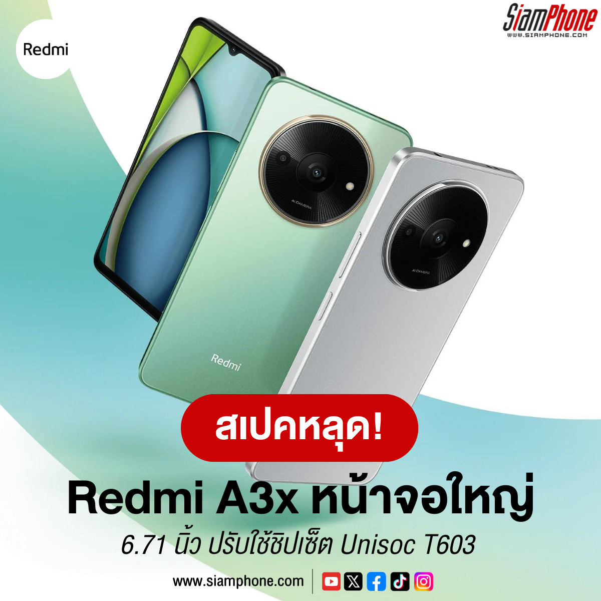 Redmi แบรนด์ในเครือของ Xiaomi เปิดตัวสมาร์ทโฟนรุ่นใหม่ Redmi A3x โดยเป็นรุ่นเล็กลงมาจาก Redmi A3 ซึ่งมีการปรับชิปเซ็ตเป็น Unisoc T603 ขนาด 22nm octa-core ความเร็ว 1.8GHz ส่วนสเปคอื่นๆ ยังเหมือนเดิมทั้งกล้องถ่ายรูป หน้าจอ และขนาดของแบตเตอรี่